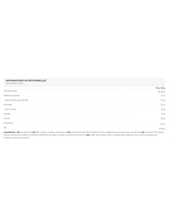 Ingredientes: leite, proteína do leite 18% (soro de leite), caseína, chocolate de leite com edulcorante 16% (maltitol), óleo vegetal, manteiga de cacau, leite em pó desnatado 3,7%, cacau, aroma natural de baunilha, emulsionante (lecitina de soja), frutose, concentrado de manteiga(leite), pasta de avelã 4,6%, avelã 2,8%, óleo de coco, ovo, sucralose, sal, corante (caramelo), aromas.
