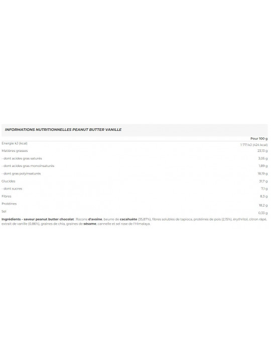 Ingredientes - Chocolate com sabor a manteiga de amendoim: aveia em flocos, manteiga de amendoim (35,87%), fibra solúvel de tapioca, proteína de ervilha (2,15%), eritritol, limão ralado, extrato de baunilha com sementes (0,86%), sementes de chia, sementes de sésamo, canela e sal rosa deHimalaya.