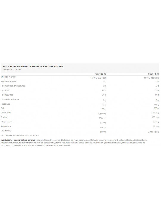 Ingredientes - Sabor a caramelo salgadoágua, maltodextrina, xarope de glucose de milho, sacarose, BCAA (L-leucina, isoleucina, L-valina), electrólitos (citrato de magnésio, cloreto de sódio, cloreto de potássio), aroma natural, acidificante (ácido cítrico), vitamina C (ácido ascórbico), emulsionante (lecitina de girassol), conservante (sorbato de potássio), gelificante (goma gelana).