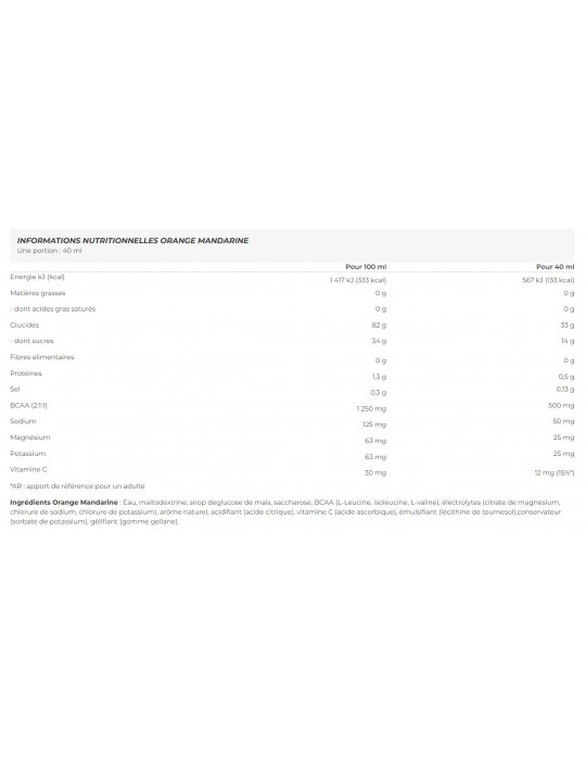 Ingredientes Laranja mandarim água, maltodextrina, xarope de glucose de milho, sacarose, BCAA (L-leucina, isoleucina, L-valina), electrólitos (citrato de magnésio, cloreto de sódio, cloreto de potássio), aroma natural, acidificante (ácido cítrico), vitamina C (ácido ascórbico), emulsionante (lecitina de girassol), conservante (sorbato de potássio), gelificante (goma gelana).