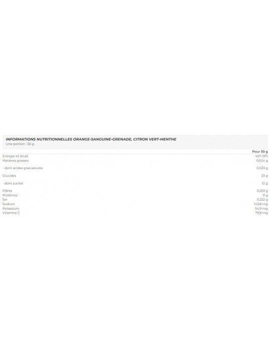 Ingredientes Melancia/Menta: Xarope de glucose, açúcar, gelificante: pectina, aroma natural, acidificante: ácido cítrico, cloreto de sódio 0,35%, ácido ascórbico 0,27%, citrato de potássio 0,18%, citrato de sódio 0,18%, óleo essencial de Mentha piperita, agente de revestimento: óleo de coco, óleo de colza, cera de carnaúbaIngredientes Arando/Maçã + Cafeína: Xarope de glucose, açúcar, gelificante: pectina, acidificante: ácido cítrico, aromas naturais, cloreto de sódio 0,35%, ácido ascórbico 0,27%, citrato de potássio 0,18%, citrato de sódio 0,18%, cafeína 0,16%, corante: antocianinas, agente de revestimento: óleo de coco, óleo de colza, cera de carnaúba