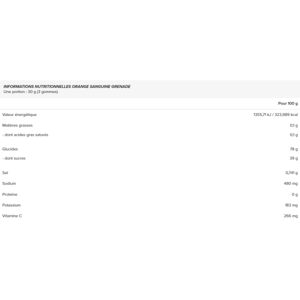Ingredientes Laranja sanguínea com romãXarope de glucose, açúcar, gelificante: pectina, aroma natural, acidificante: ácido cítrico, extrato de curcuma, ácido ascórbico 0,27%, cloreto de sódio 0,35%, citrato de potássio 0,18%, citrato de sódio 0,18%, cafeína 0,16%, concentrado de cártamo, concentrado de cenoura preta, óleo essencial de gengibre, agente de revestimento: óleo de coco, óleo de colza, cera de carnaúba.