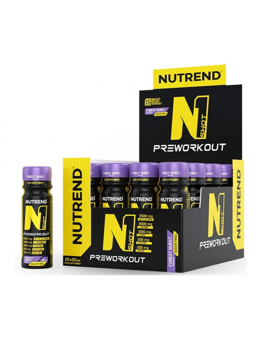 Embalagem de N1 Shot (20x60ml) da marca Nutrendsão shots prontos a beber para utilizar alguns minutos antes do treino.