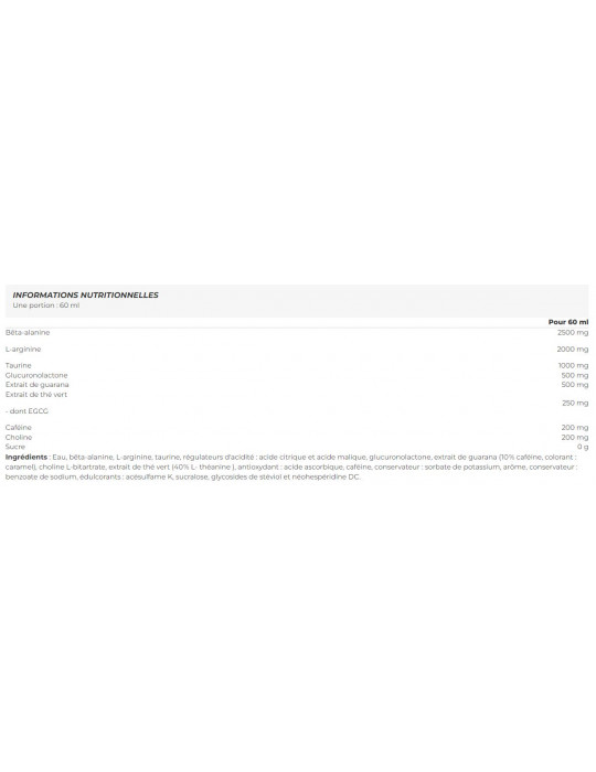 Ingredientes: Água, beta-alanina, L-arginina, taurina, reguladores de acidez: ácido cítrico e ácido málico, glucuronolactona, extrato de guaraná (10 % de cafeína, cor: caramelo), L-bitartarato de colina, extrato de chá verde (40 % de L-teanina), antioxidante: ácido ascórbico, cafeína, conservante: sorbato de potássio, aroma, conservante: benzoato de sódio, edulcorantes: acessulfame K, sucralose, glicosídeos de esteviol e neohesperidina DC.