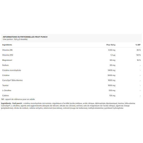 Ingredientes - Ponche de fruta : creatina mono-hidratada micronizada, reguladores de acidez (ácido málico, ácido cítrico, difosfato dipotássico), taurina, beta-alanina CarnoSyn®, L-citrulina, agentes antiaglomerantes (dióxido de silício, silicato de cálcio), aromas, sais de magnésio do ácido cítrico, agente de volume (polidextrose), citrato de sódio, cafeína anidra, edulcorante (sucralose), corante (vermelho de beterraba), metilcobalamina, piridoxal-5-fosfato.