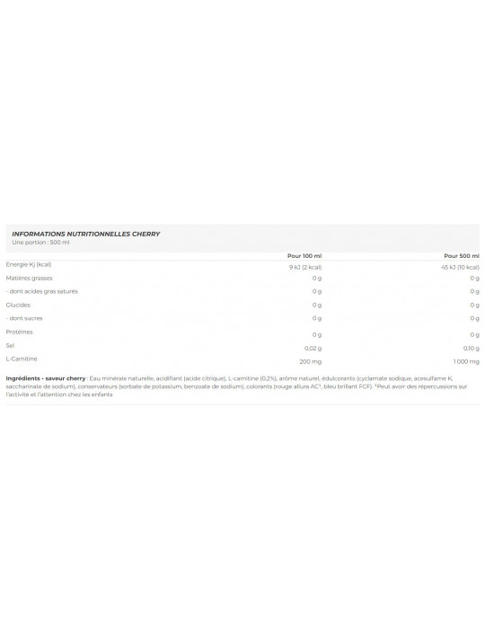 Ingredientes - Sabor a cereja: Água mineral natural, acidificante (ácido cítrico), L-carnitina (0,2%), aroma natural, edulcorantes (ciclamato de sódio, acessulfame K, sacarinato de sódio), conservantes (sorbato de potássio, benzoato de sódio), corantes (vermelho allura AC¹, azul brilhante FCF). pode afetar a atividade e a atenção das crianças