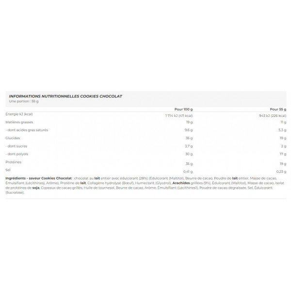 Ingredientes - Chocolate com sabor a bolacha: chocolate de leite inteiro com edulcorante (28%) (Edulcorante (Maltitol), Manteiga de cacau, Leite inteiro em pó, Massa de cacau, Emulsionante (Lecitinas), Aromatizante), Proteína de leite, Colagénio hidrolisado (Carne de vaca), Humectante (Glicerol), Amendoins torrados (9%), Edulcorante (Maltitol), Massa de cacau, Isolado de proteína de soja, Nibs de cacau torrados, Óleo de girassol, Manteiga de cacau, Aroma, Emulsionante (Lecitinas1), Cacau em pó desengordurado, Sal, Edulcorante (Sucralose).