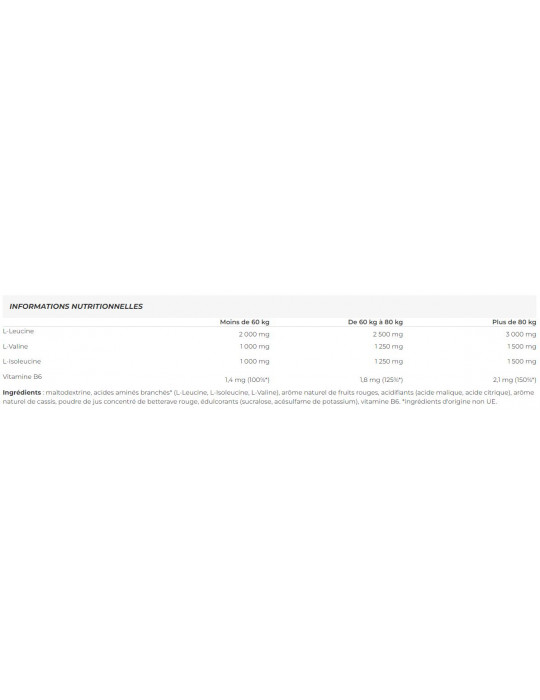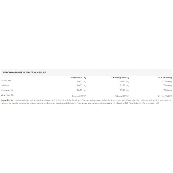 Ingredientes: maltodextrina, aminoácidos de cadeia ramificada* (L-Leucina, L-Isoleucina, L-Valina), aroma natural de frutos vermelhos, acidificantes (ácido málico, ácido cítrico), aroma natural de groselha preta, sumo concentrado de beterraba vermelha em pó, edulcorantes (sucralose, acessulfame de potássio), vitamina B6. *ingredientes de origem não comunitária.