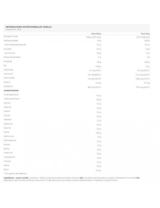 Ingredientes - Sabor a baunilha : prolacta® * (95,5%) (isolado de proteínas solúveis nativas do leite, emulsionante (lecitina de girassol)), maltodextrina, aromas(leite), espessante (goma xantana), vitaminas (C, E, B6), edulcorante (sucralose), corante (betacaroteno). *ingredientes de origem francesa.