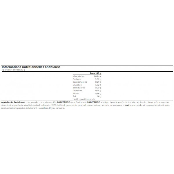 Ingredientes Andaluziaágua, amido de milho modificado,MOUTARDE(água, sementesMOUTARDE, vinagre, especiarias), polpa de tomate, sal, sumo de limão, aroma, cebola, malagueta, vinagre, óleo vegetal (colza), corantes (E170, luteína), goma de guar, alho, conservante: sorbato de potássio,OvoAmarelo, ácido alimentar: ácido cítrico, salsa, extrato de paprica, edulcorante: sucralose, tomilho, canela.