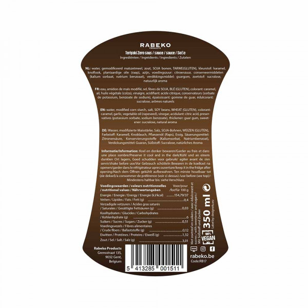 Ingredientes do teriyaki água, amido de milho modificado, grãos de milhosoja (feijões SOJA, , TRIGO (glúten), sal), corante: caramelo, sal, maltodextrina, alho, óleo vegetal (colza), vinagre, acidificante: ácido cítrico, conservante: sorbato de potássio, espessante: goma de guar, edulcorante: sucralose, aromas naturais.
