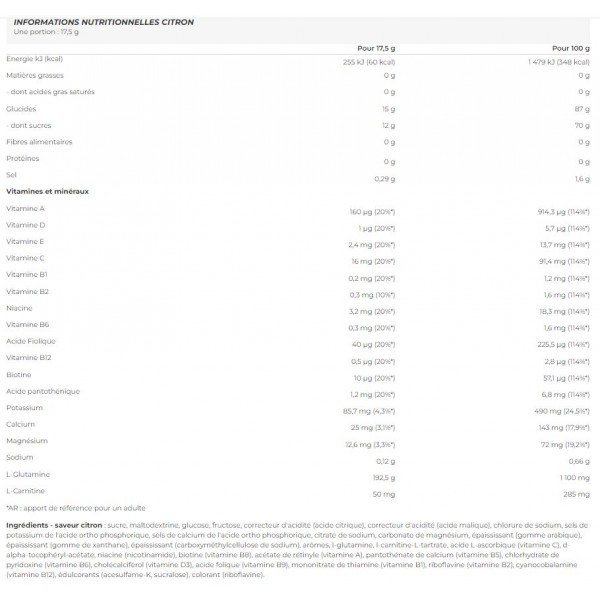 Ingredientes - Aroma a limão: açúcar, maltodextrina, glucose, frutose, regulador de acidez (ácido cítrico), regulador de acidez (ácido málico), cloreto de sódio, sais de potássio do ácido ortofosfórico, sais de cálcio do ácido ortofosfórico, citrato de sódio, carbonato de magnésio, espessante (goma arábica), espessante (goma xantana), espessante (carboximetilcelulose de sódio), aromas, l-glutamina, l-carnitina-L-tartarato, ácido L-ascórbico (vitamina C), acetato de d-alfa-tocoferilo, niacina (nicotinamida), biotina (vitamina D), acetato de retinilo (vitamina A), pantotenato de cálcio, cloridrato de piridoxina (vitamina B6), colecalciferol (vitamina D), mononitrato de tiamina (vitamina B1), riboflavina (vitamina B2), cianocobalamina (vitamina B12), edulcorantes (acessulfame-K, sucralose), corante (riboflavina).