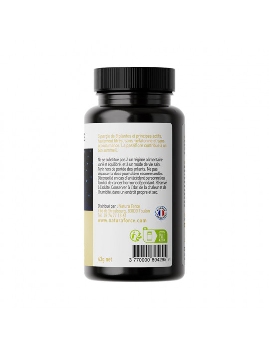 Elaborado a partir de uma mistura de plantas e de princípios activos de qualidade, inclui: passiflora, papoila, eschscholzia, lúpulo, GABA, ornitina, glicina e espinheiro. Cada uma destas plantas contribui para favorecer o sono e apoiar os diferentes ciclos de sono. Ajudam-no a relaxar e a desfrutar de um sono profundo e reparador. Este suplemento é 100% natural, sem hormonas sintéticas nem melatonina. É também altamente titulado em princípios activos e fabricado em França.