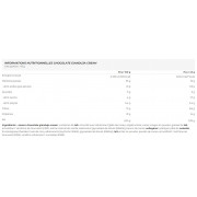 Ingredientes - Chocolate gianduia sabor creme : proteína de leite, chocolate com edulcorante [massa de cacau, oligofrutose, cacau magro em pó, gordura de leite, emulsionante : [érythritol (E960), glycosides de stéviol (E960a)] lecitina de girassol (E322), aroma natural de baunilha, edulcorante glicosídeos de esteviol (E960a)], manteiga de cacau, colagénio hidrolisado, pasta de avelã, fruto-oligossacáridos, óleo de coco, edulcorantes, leite gordo em pó, cacau em pó, emulsionante: lecitina de girassol (E322), vanilina, edulcorante: sucralose (E955).
