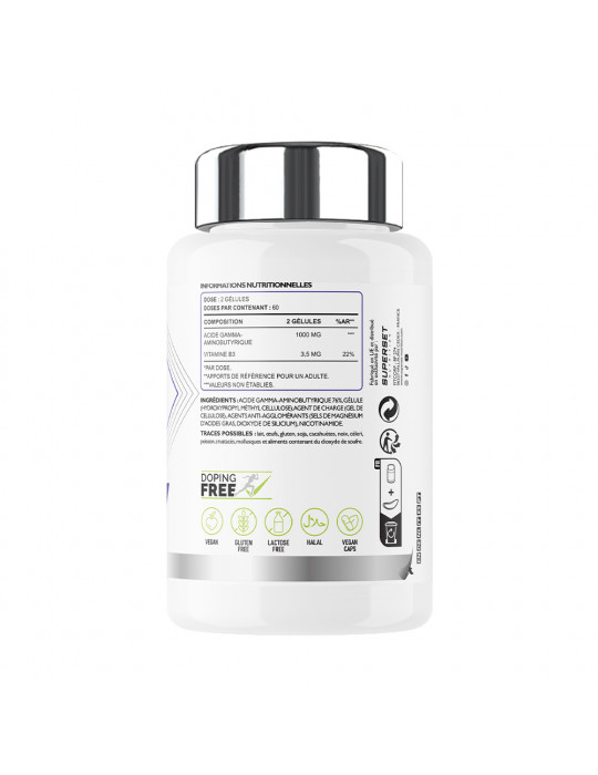 Ingredientes: ácido gama-aminobutírico 76%, cápsula (hidroxipropilmetilcelulose), agente de volume (gel de celulose), antiaglomerantes (sais de magnésio de ácidos gordos, dióxido de silício), nicotinamida.
