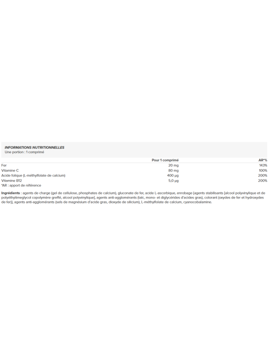 {agents stabilisants [alcool polyvinylique et de polyéthylèneglycol copolymère greffé, alcool polyvinylique], agents anti-agglomérants (talc, mono- et diglycérides d'acides gras), colorant (oxydes de fer et hydroxydes de fer)}Ingredientes: agentes de volume (gel de celulose, fosfatos de cálcio), gluconato de ferro, ácido L-ascórbico, revestimento, agentes antiaglomerantes (sais de ácidos gordos de magnésio, dióxido de silício), L-metilfolato de cálcio, cianocobalamina.