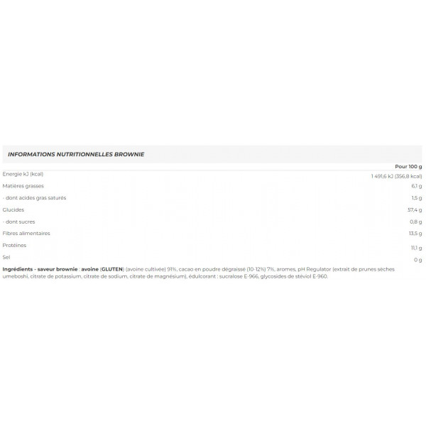 Ingredientes - sabor a brownie: aveia(GLÚTEN) (aveia cultivada) 91%, cacau em pó desengordurado (10-12%) 7%, aromas, regulador de pH (extrato de ameixa seca umeboshi, citrato de potássio, citrato de sódio, citrato de magnésio), edulcorante: sucralose E-966, glicosídeos de esteviol E-960.