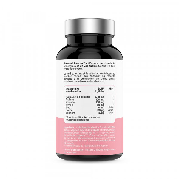 Composta por uma sinergia de 7 princípios activos com virtudes complementares - queratina, arginina, biotina (vitamina B8), bisglicinato de zinco, mirtilo, selénio e rúcula - esta fórmula tem como objetivo tornar o seu cabelo sublime, tornando-o mais forte, mais longo e mais saudável.