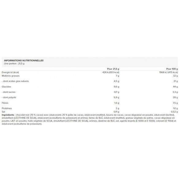 Ingredientes: chocolate preto (70% cacau) com edulcorantes 25% (massa de cacau, edulcorante (maltitol), manteiga de cacau, cacau em pó desengordurado, edulcorante (lactitol), emulsionante (LÉCITINA DE SOJA), edulcorante (acessulfame de potássio) e aromatizante), farinha de TRIGO, edulcorante (maltitol), gordura vegetal de palma, cacau em pó desengordurado, LEITE em pó, óleo vegetal de soja, emulsionante (lecitina de soja), aromas, dextrina de trigo, sal, levedantes (E 500ii e E 503ii), corante (E 150d) e edulcorante (acessulfame de potássio).