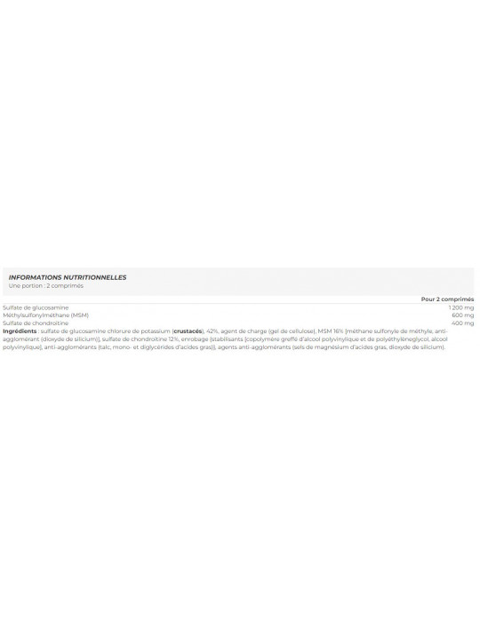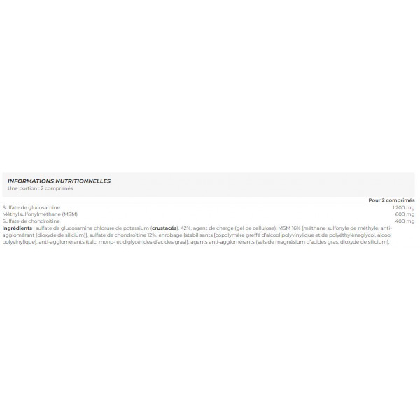 [méthane sulfonyle de méthyle, anti-agglomérant (dioxyde de silicium)] {stabilisants [copolymère greffé d’alcool polyvinylique et de polyéthylèneglycol, alcool polyvinylique], anti-agglomérants (talc, mono- et diglycérides d’acides gras)}Ingredientes: cloreto de potássio de sulfato de glucosamina(crustáceos), 42%, agente de volume (gel de celulose), MSM 16%, sulfato de condroitina 12%, revestimento, agentes antiaglomerantes (sais de magnésio de ácidos gordos, dióxido de silício).