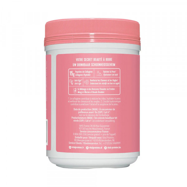 Ingredientes: péptidos de colagénio (origem bovina), morango em pó (Fragaria ananassa) (9,5%), água de coco em pó (Cocos nucifera L.), ácido hialurónico (a partir de hialuronato de sódio), aroma de limão com outros aromas naturais, biotina.