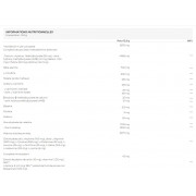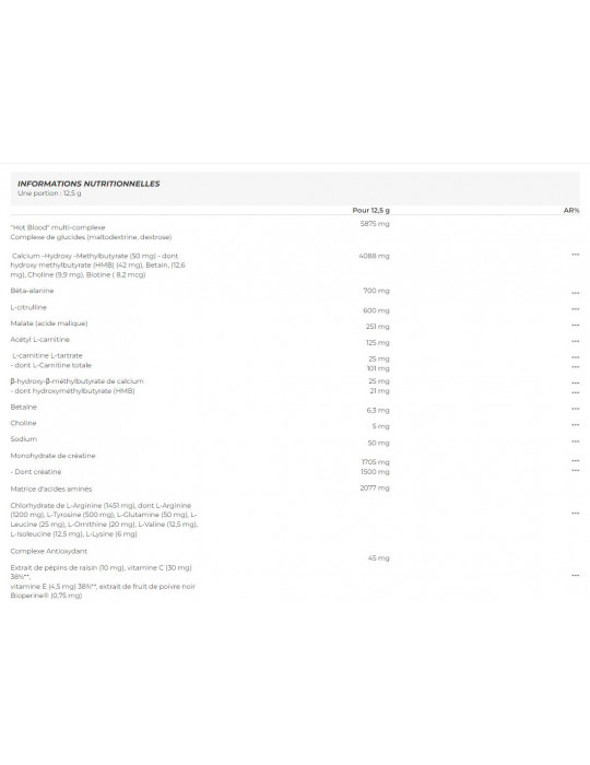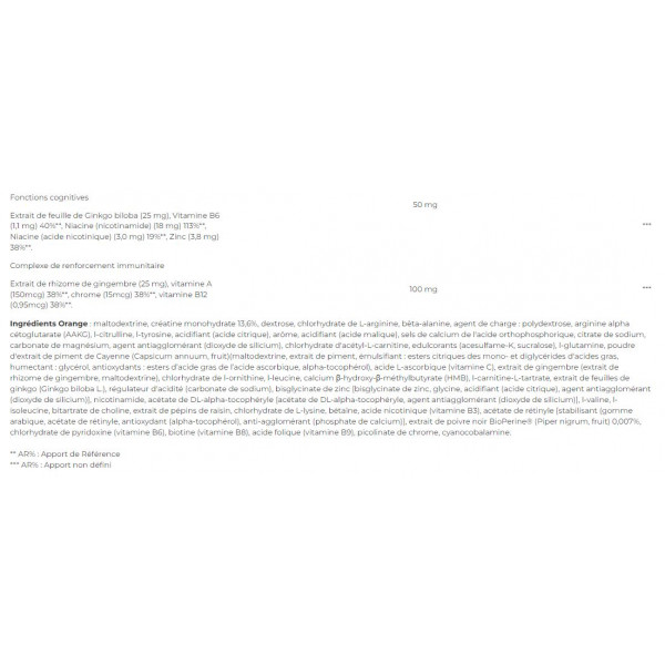 Ingredientes laranja: maltodextrina, creatina mono-hidratada 13,6%, dextrose, cloridrato de L-arginina, beta-alanina, agente de volume : polidextrose, alfa-cetoglutarato de arginina (AAKG), l-citrulina, l-tirosina, acidificante (ácido cítrico), aromatizante, acidificante (ácido málico), sais de cálcio do ácido ortofosfórico, citrato de sódio, carbonato de magnésio, agente antiaglomerante (dióxido de silício), cloridrato de acetil-L-carnitina, edulcorantes (acessulfame-K, sucralose), l-glutamina, extrato de pimenta de caiena em pó (Capsicum annuum, fruto) (maltodextrina, extrato de pimenta, emulsionante : ésteres cítricos de mono e diglicéridos de ácidos gordos, humectante: glicerol, antioxidantes: ésteres de ácidos gordos do ácido ascórbico, alfa-tocoferol), ácido L-ascórbico (vitamina C), extrato de gengibre (extrato de rizoma de gengibre, maltodextrina), cloridrato de l-ornitina, l-leucina, β-hidroxi-β-metilbutirato de cálcio (HMB), L-carnitina-L-tartarato, extrato de folhas de ginkgo (Ginkgo biloba L. [bisglycinate de zinc, glycine, acidifiant (acide citrique), agent antiagglomérant (dioxyde de silicium)] [acétate de DL-alpha-tocophéryle, agent antiagglomérant (dioxyde de silicium)]), regulador de acidez (carbonato de sódio), bisglicinato de zinco, nicotinamida, acetato de DL-alfa-tocoferilo, l-valina, l-isoleucina, bitartarato de colina, extrato de grainha de uva, cloridrato de L-lisina, betaína, [stabilisant (gomme arabique, acétate de rétinyle, antioxydant (alpha-tocophérol), anti-agglomérant (phosphate de calcium)] ácido nicotínico (vitamina B3), acetato de retinilo, BioPerine® extrato de pimenta preta (Piper nigrum, fruto) 0,007%, cloridrato de piridoxina (vitamina B6), biotina (vitamina B8), ácido fólico (vitamina B9), picolinato de crómio, cianocobalamina.
