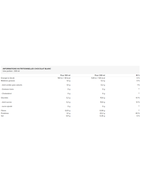 Rico em proteínas, com 20 g por frasco, as proteínas desempenham um papel essencial no desenvolvimento muscular. Sem adição de açúcar ou gordura, esta bebida é uma óptima solução para os seus lanches ou pequenos-almoços proteicos.