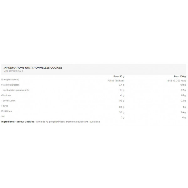Com 39g de hidratos de carbono por porção, este creme de arroz é uma alternativa interessante para diversificar as fontes de hidratos de carbono da sua alimentação. O seu elevado índice glicémico garante que os hidratos de carbono são rapidamente absorvidos pelo organismo, constituindo uma fonte de energia imediata. É, por isso, uma escolha ideal para recarregar as reservas de glicogénio antes do treino e para as repor após o exercício.