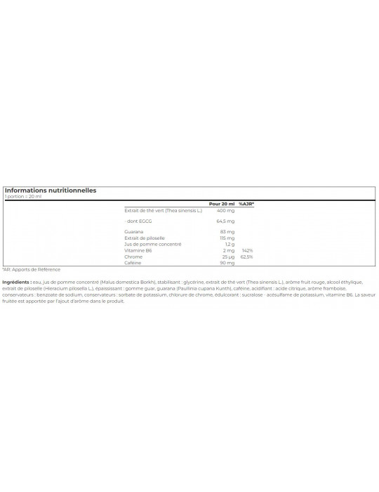 RA: Dose de referênciaIngredientes: água, sumo de maçã concentrado (Malus domestica Borkh), estabilizador: glicerina, extrato de chá verde (Thea sinensis L.), aroma de frutos vermelhos, álcool etílico, extrato de pilosela (Hieracium pilosella L.), espessante: goma de guar, guaraná (Paullinia cupana Kunth), cafeína, acidificante: ácido cítrico, aroma de framboesa, conservantes: benzoato de sódio, conservantes: sorbato de potássio, cloreto de crómio, edulcorante: sucralose - acessulfame de potássio, vitamina B6. O sabor frutado é adicionado através da aromatização do produto.