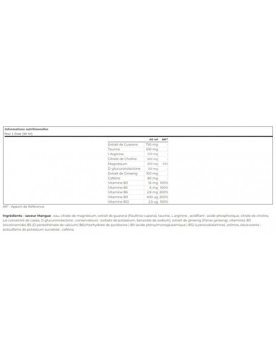 Ingredientes - Sabor a manga: água, citrato de magnésio, extrato de guaraná (Paullinia cupana), taurina, L-arginina, acidificante: ácido fosfórico, citrato de colina, sumo de groselha concentrado, D-glucuronolactona, conservantes: sorbato de potássio, benzoato de sódio), extrato de ginseng (Panax ginseng), vitaminas: B3 (nicotinamida) B5 (D-pantotenato de cálcio) B6 (cloridrato de piridoxina) B9 (ácido pteroilmonoglutâmico) B12 (cianocobalamina), aromatizantes, edulcorantes: acessulfame de potássio sucralose, cafeína.