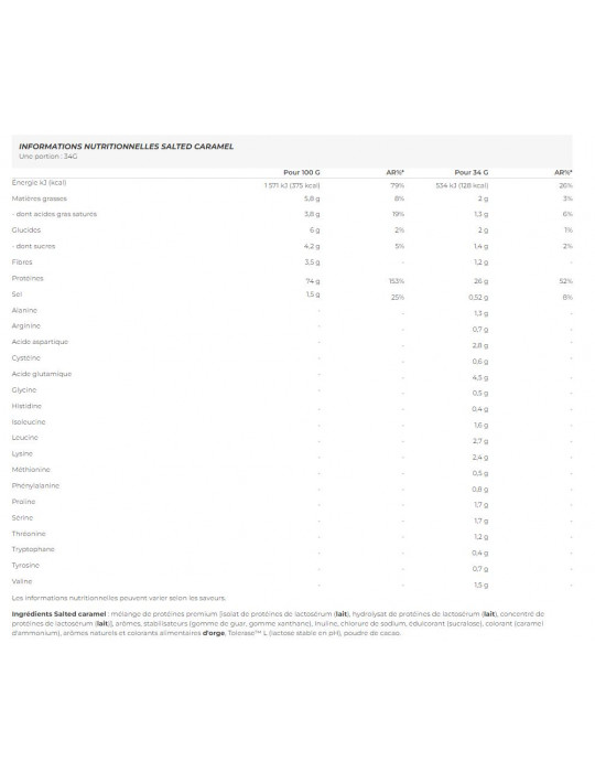 Ingredientes Caramelo salgadoMistura de proteínas premium [proteína isolada de soro de leite (leite), hidrolisado de proteína de soro de leite (leite), concentrado proteico de soro de leite (leite)], aromas, estabilizadores (goma de guar, goma xantana), inulina, cloreto de sódio, edulcorante (sucralose), corante (caramelo de amónio), aromas naturais e corantes alimentares cevada, tolerase™ L (lactose estável ao pH), cacau em pó.