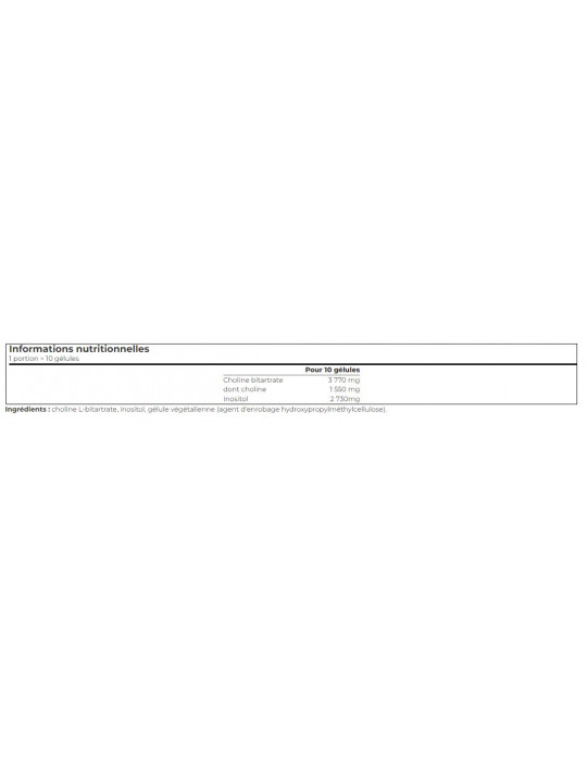 Ingredientes: L-bitartarato de colina, inositol, cápsula vegana (agente de revestimento: hidroxipropilmetilcelulose).