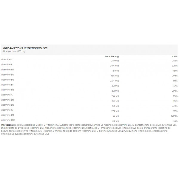 Ingredientes: ácido L-ascórbico Quali®-C (vitamina C), EVNol tocotrienol tocoferol (vitamina E), niacinamida (vitamina B3), D-pantotenato de cálcio (vitamina B5), cloridrato de piridoxina (vitamina B6), mononitrato de tiamina (vitamina B1), riboflavina 5' - fosfato de sódio (vitamina B2), cápsula transparente (gelatina de bovino), acetato de retinilo (vitamina A), Metafolin L-metil folato de cálcio (vitamina B9), D-biotina (vitamina B8), filoquinona (vitamina K1), colecalciferol (vitamina D), cianocobalamina (vitamina B12).