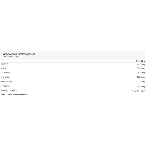 Ingredientes: Base de L-Citrulina, beta-alanina CarnoSyn®, glicerol GlyceroMax™, sumo de limão biológico, aromas naturais, acidificante: ácido málico natural, inulina, extrato de grão de café verde (Coffea arabica) titulado com cafeína, edulcorante: sucralose.