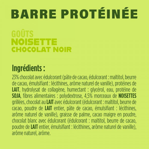 Ingredientes - Chocolate com sabor a avelã23% de chocolate com edulcorante (massa de cacau, edulcorante: maltitol, manteiga de cacau, manteiga de cacau, emulsionante: lecitina, aroma natural de baunilha), proteína de LEITE, hidrolisado de colagénio, humectante: glicerol, água, proteína de SOJA, fibra alimentar: polidextrose, 4,5% de pedaços de NOISETTES grelhados, chocolate LEITE com edulcorante (edulcorante: maltitóis, manteiga de cacau, cacau em pó) LEITE inteiro, massa de cacau, emulsionante: lecitinas, aroma natural de baunilha), gordura de palma, cacau em pó magro, chocolate branco com edulcorante (edulcorante: maltitol, manteiga de cacau, cacau em pó, sólidos de cacau) LEITE integral, emulsionante: lecitinas, aroma natural de baunilha), aroma natural, aromatizante.