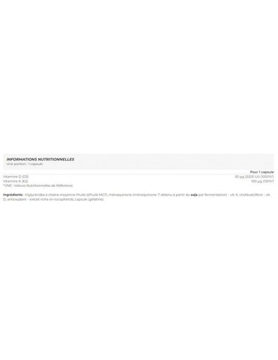 VRN: Valor de Referência DietéticoIngredientes: óleo de triglicéridos de cadeia média (óleo MCT), menaquinona (menaquinona-7 obtida da soja por fermentação) - vit. K, colecalciferol - vit. D, antioxidante - extrato rico em tocoferóis; cápsula (gelatina).