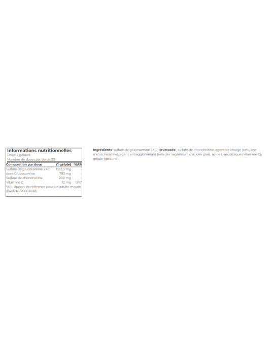Ingredientes: sulfato de glucosamina 2KCl(marisco), sulfato de condroitina, agente de volume (celulose microcristalina), agente antiaglomerante (sais de magnésio de ácidos gordos), ácido L-ascórbico (vitamina C), cápsula (gelatina).