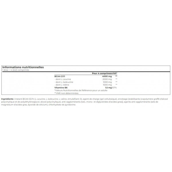 Ingredientes : BCAA instantâneo 53,1% (L-leucina, L-isoleucina, L-valina, emulsionante: 0), agente de volume (gel de celulose), revestimento [stabilisants (copolymère greffé d'alcool polyvinylique et de polyéthylèneglycol, alcool polyvinylique), anti-agglomérants (talc, mono- et diglycérides d'acides gras)], agentes antiaglomerantes (sais de magnésio de ácidos gordos, dióxido de silício), cloridrato de piridoxina.