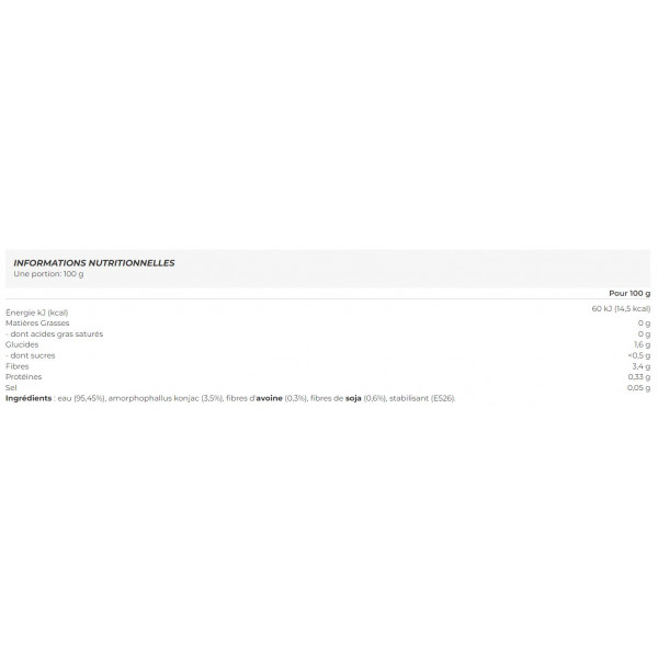Ingredientes: água (95,45%), amorphophallus konjac (3,5%), fibrade aveia (0,3%), fibra de soja (0,6%), estabilizador (E526).