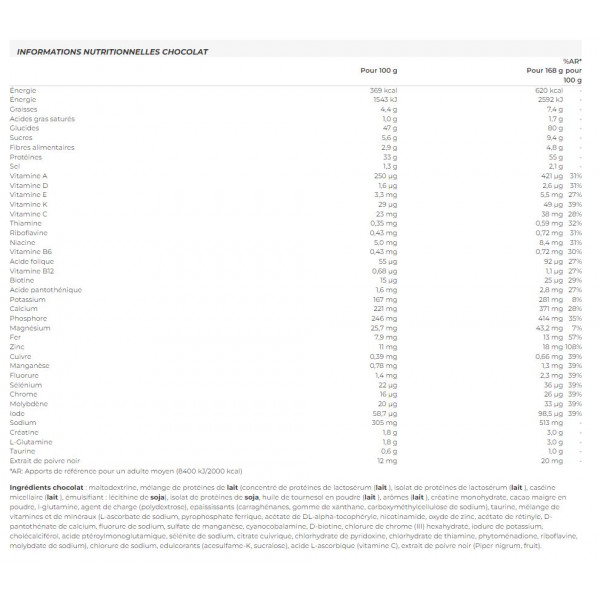 Ingredientes do chocolate : maltodextrina, mistura de proteínas deleite(concentrado de proteínas de soro de leite (leite), isolado de proteína de soro de leite (leite), caseína micelar (leite), emulsionante: lecitina de soja), isolado proteico de soja, óleo de girassol em pó (leite), aromas (leite), creatina mono-hidratada, cacau magro em pó, l-glutamina, agente de volume (polidextrose), espessantes (carragenina, goma xantana, carboximetilcelulose de sódio), taurina, mistura de vitaminas e minerais (L-ascorbato de sódio, pirofosfato férrico, acetato de DL-alfa-tocoferilo, nicotinamida, óxido de zinco, acetato de retinilo, D-pantotenato de cálcio, fluoreto de sódio, sulfato de manganês cianocobalamina, D-biotina, cloreto de crómio (III) hexa-hidratado, iodeto de potássio, colecalciferol, ácido pteroilmonoglutâmico, selenito de sódio, citrato cúprico, cloridrato de piridoxina cloridrato de tiamina, fitomenadiona, riboflavina, molibdato de sódio), cloreto de sódio, edulcorantes (acessulfame-K, sucralose), ácido L-ascórbico (vitamina C), extrato de pimenta preta (Piper nigrum, fruto).