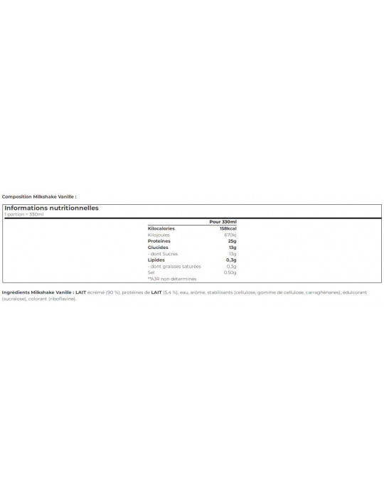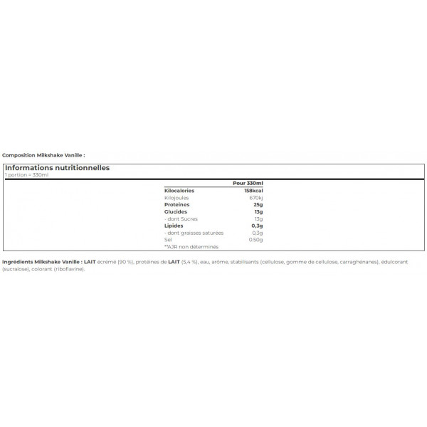 Ingredientes Batido de baunilha: LEITE desnatado, concentrado proteico de LEITE (30%), leite desnatado em pó, água, aroma natural, estabilizadores (celulose, goma de celulose, carragenina), edulcorante (sucralose), corante (riboflavina).