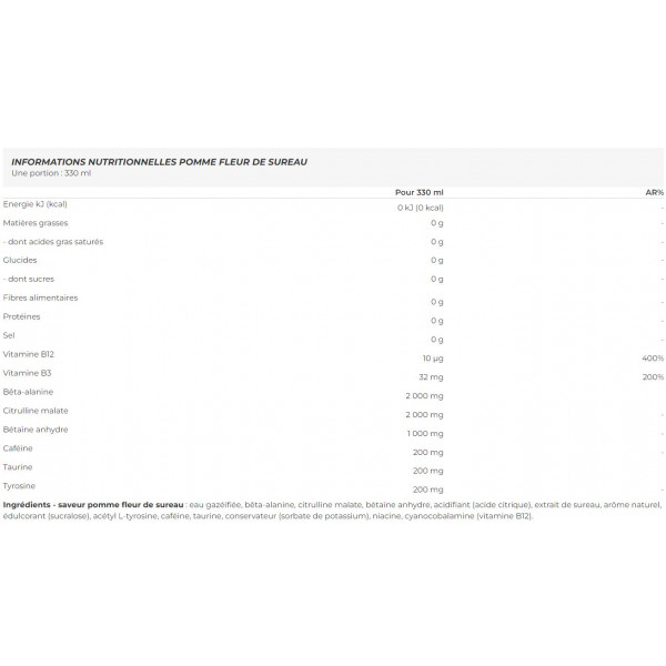 Ingredientes - flor de sabugueiro sabor maçãágua gaseificada, beta-alanina, citrulina, betaína anidra, acidificante (ácido cítrico), extrato de sabugueiro, aroma natural, edulcorante (sucralose), acetil L-tirosina, cafeína, taurina, sorbato de potássio, niacina, cianocobalamina (vitamina B12).