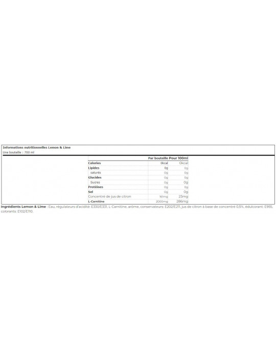 Ingredientes Limão e lima água, reguladores de acidez: E330/E331, L-Carnitina, aroma, conservantes: E202/E211, sumo de limão concentrado 0,5%, edulcorante: E955, corantes: E102/E110.