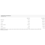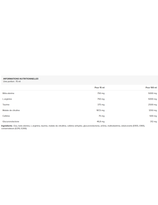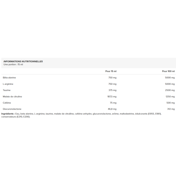 Ingredientes : Água, beta alanina, L-arginina, taurina, malato de citrulina, cafeína anidra, glucuronolactona, aroma, maltodextrina, edulcorantes (E955, E961), conservantes (E210, E200).