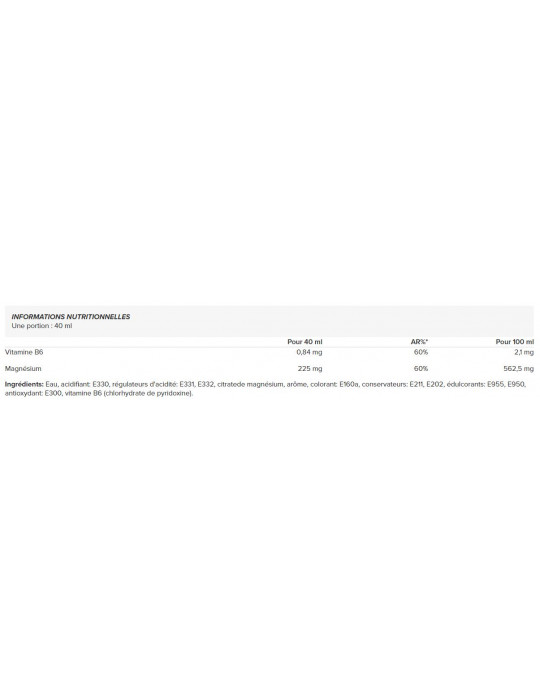 Ingredientes: Água, acidificante: E330, reguladores de acidez: E331, E332, citrato de magnésio, aroma, corante: E160a, conservantes: E211, E202, edulcorantes: E955, E950, antioxidante: E300, vitamina B6 (cloridrato de piridoxina).
