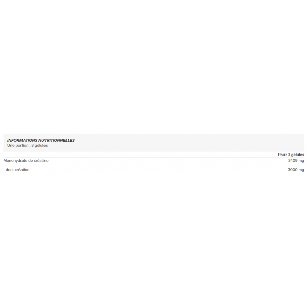 Cada dose de 3 cápsulas fornece 3 g de creatina mono-hidratada micronizada (200 MESH), uma forma refinada de creatina que oferece uma excelente solubilidade e biodisponibilidade. O seu elevado grau de micronização favorece uma dissolução rápida e uma assimilação optimizada.