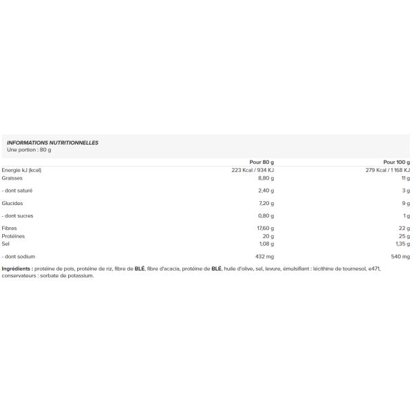 Ingredientes: proteína de ervilha, proteína de arroz, fibra de TRIGO, fibra de acácia, proteína de TRIGO, azeite, sal, levedura, emulsionante: lecitina de girassol, e471, conservantes: sorbato de potássio.