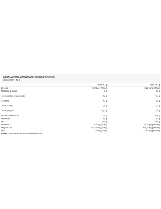 Ingredientes Coco: 42% mistura proteica [concentrado proteico de leite MPC, hidrolisado de colagénio, isolado proteico de soja, glúten de trigo hidrolisado, concentrado proteico de soro de leite WPC(leite)], 19% chocolate branco com edulcorante [edulcorante: maltitóis; manteiga de cacau, leite gordo em pó, emulsionante: lecitinas (soja); aroma natural de baunilha], humectantes: sorbitóis, glicerol; polidextrose, óleo vegetal (girassol), 2% de coco ralado, maltodextrina, emulsionante: lecitinas (soja); sal, aroma, edulcorante: sucralose; bisglicinato de zinco (de Albion™ aminoácido quelatado), colecalciferol - vit. D, óxido de magnésio.