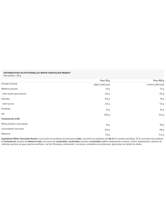 Ingredientes Chocolate branco com amendoim: Concentrado de proteínas de soro de leite[leite], concentrado de proteínas de leite (85% caseína micelar, 15% concentrado de proteínas de soro de leite), leitelho em pó[leite], pedaços de amendoim, amendoins moídos, amendoins torrados desengordurados moídos, aroma, espessante : goma de celulose, goma de guar, goma xantana; sal deHimalaya, edulcorantes: sucralose, acessulfame de potássio, glicosídeos de esteviol de estévia.