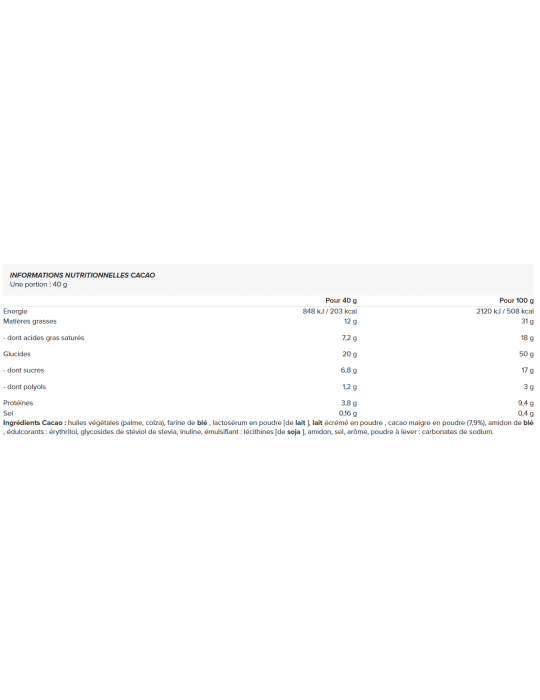 Ingredientes Cacau: óleos vegetais (palma, colza), farinha de trigo, soro de leite em pó [de leite], leite em pó desnatado, cacau em pó magro (7,9%), amido de trigo, edulcorantes: eritritol, glicosídeos de esteviol de estévia, inulina, emulsionante: lecitina [de soja], amido, sal, aromatizante, levedante: carbonatos de sódio.